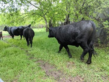 Cattle are herbivores which means they are best suited for eating grass. We want to fully benefit from the healthy CLAs that grass fed beef produces. We only supplement with field peas, organic alfalfa pellets, hay, molasses and black oil sunflower seeds as needed.